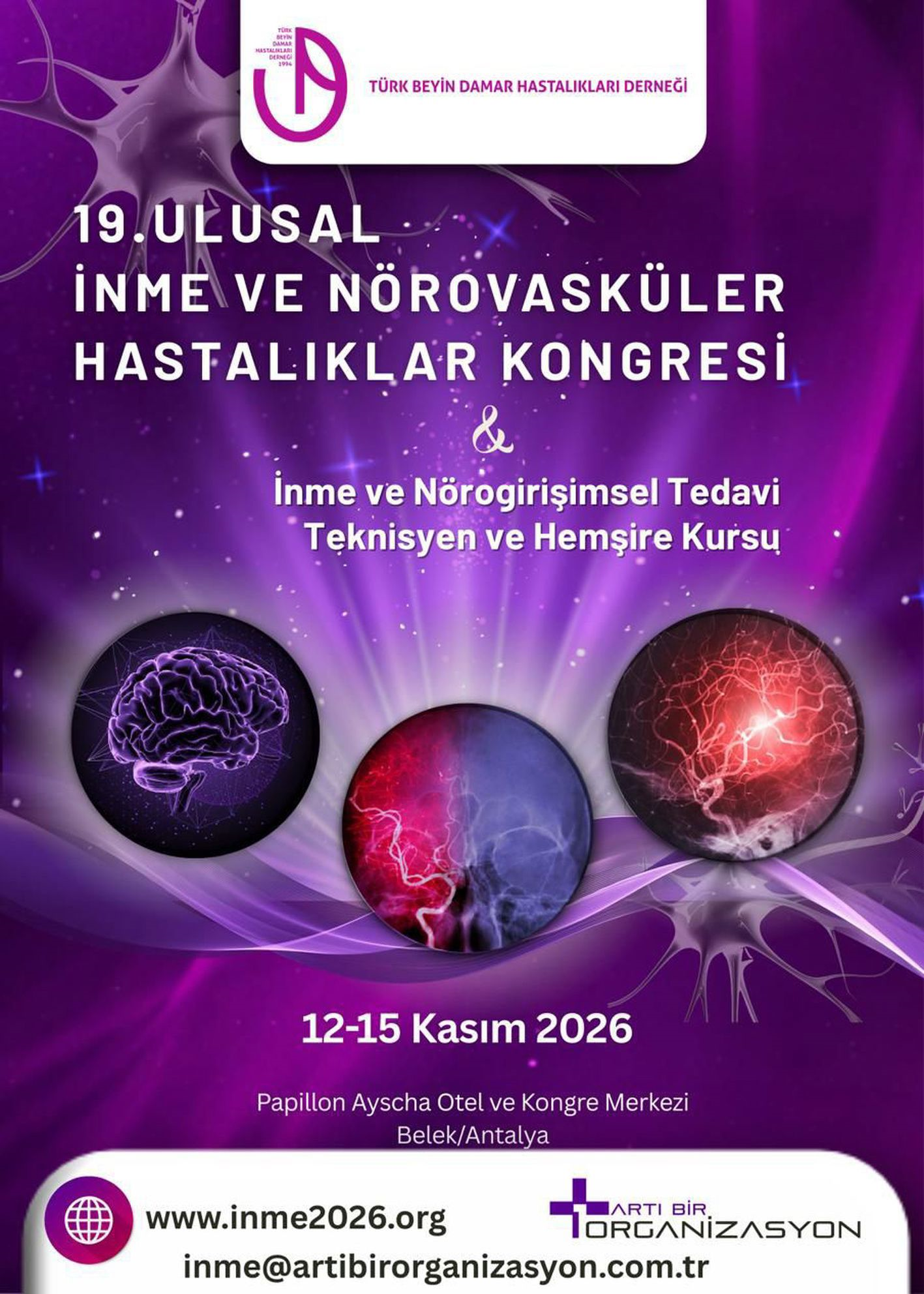 19. Ulusal İnme ve Nörovasküler Hastalıklar Kongresi ve İnme ve Nörogirişimsel Tedavi Teknisyen ve Hemşire Kursu 12-15 Kasım 2026 tarihleri arasında Papillon Ayscha Otel ve Kongre Merkezi, Belek, Antalya'da gerçekleştirilecektir.