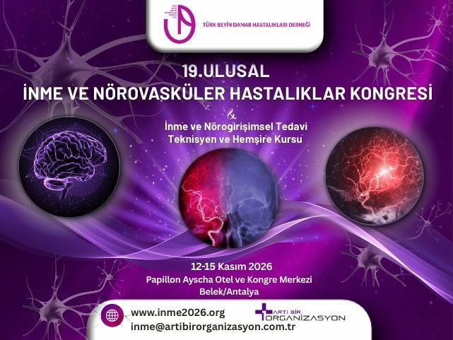 19. Ulusal İnme ve Nörovasküler Hastalıklar Kongresi ve İnme ve Nörogirişimsel Tedavi Teknisyen ve Hemşire Kursu 12-15 Kasım 2026 tarihleri arasında Papillon Ayscha Otel ve Kongre Merkezi, Belek, Antalya'da gerçekleştirilecektir.