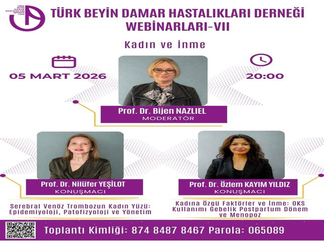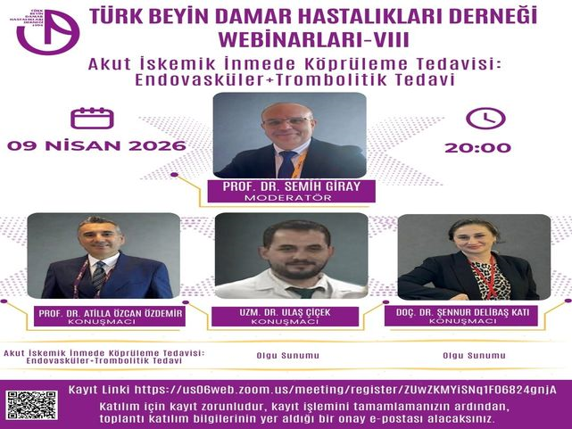 Türk Beyin Damar Hastalıkları Derneği Webinarları'nın sekizincisi 5 Mart 2026 Saat: 20:00'de gerçekleştirilecektir. Not: Katılım için kayıt zorunluluğu vardır, toplantı öncesi lütfen linkten kaydınızı tamamlayınız.